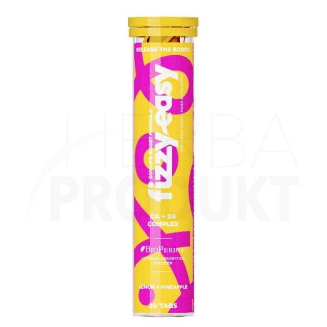 DuoLife Boost Formula FIZZY EASY Ca + D3 COMPLEX sú šumivé tablety na prípravu osviežujúceho nápoja s ovocnou príchuťou citrónovo-ananásová príchuť).