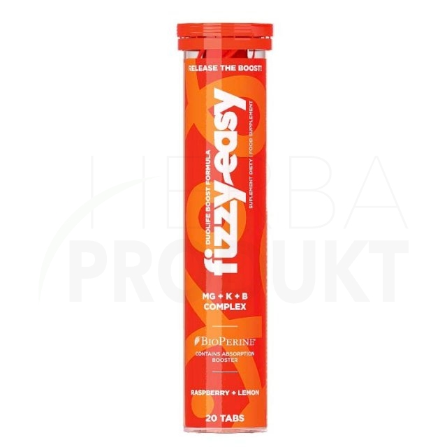 DuoLife Boost Formula FIZZY EASY Mg + K + B COMPLEX sú šumivé tablety na prípravu osviežujúceho nápoja s ovocnou príchuťou (malinovo-citrónová príchuť).
