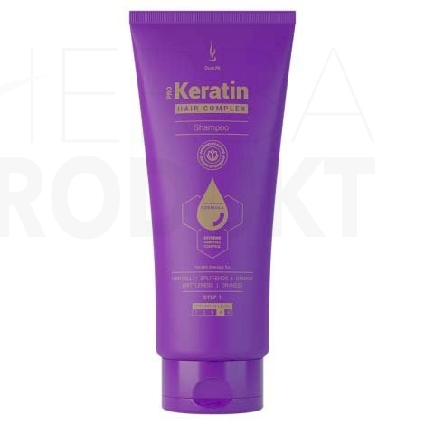 Šampón Pro Keratin Hair Complex je kozmetickým prípravkom pre vlasy, ktoré vypadávajú, sú suché, poškodené, majú rozštiepené koncovky a sú bez lesku. Kombinácia až 6 účinných látok, t. j. extrakt z hrachových klíčkov, extraktu z listov pŕhľavy, hydrolyzovaného keratínu, extraktu z pupočníka ázijského, extraktu z čučoriedok a močoviny nám umožnili vytvoriť nový rozmer starostlivosti o vlasy.