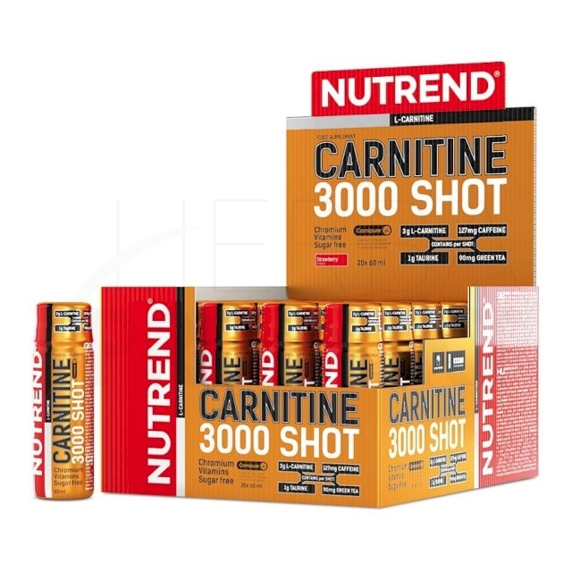 CARNITINE 3000 SHOT príchuť pomaranč: voda,L-karnitín, taurín, regulátor kyslosti kyselina citrónová, kofeín, mliečnan chromitý, extrakt zeleného čaju (50% polyfenolov, 8% kofeínu), emulzia pomaranč (aróma,farbivá E 104 a E 110 - môžu nepriaznivo ovplyvňovať činnosť a pozornosť detí),konzervanty sorban draselný a benzoan sodný, nikotínamid (vitamín B3), sladidlá acesulfam K a sukralóza, D-pantotenát vápenatý (vitamín B5), sladidlo steviol-glykozidy, pyridoxín hydrochlorid (vitamín B6), tiamín hydrochlorid(vitamín B1) .