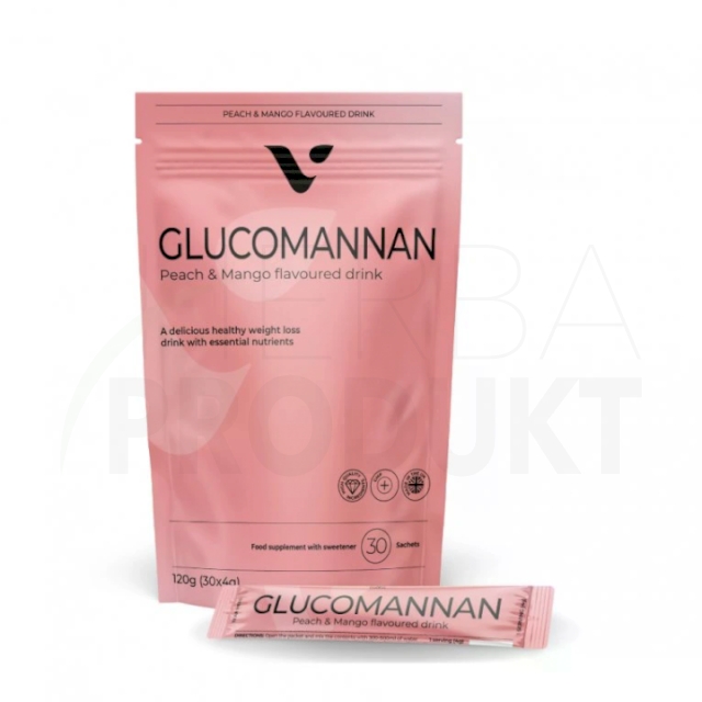 Vychutnajte si osviežujúcu chuť nápoja Glucomannan Peach and Mango, ktorý je vytvorený ako doplnok k vyváženej strave a zdravému životnému štýlu. Každé vrecko obsahuje 1000 mg vysokokvalitného glukomananu, čo je prirodzene získavaná vláknina z rastliny konjac, ktorá je známa svojou schopnosťou prispievať ku kontrole hmotnosti tým, že podporuje pocit sýtosti. Prispieva ku kontrole hmotnosti ako súčasť vyváženej stravy a životného štýlu.